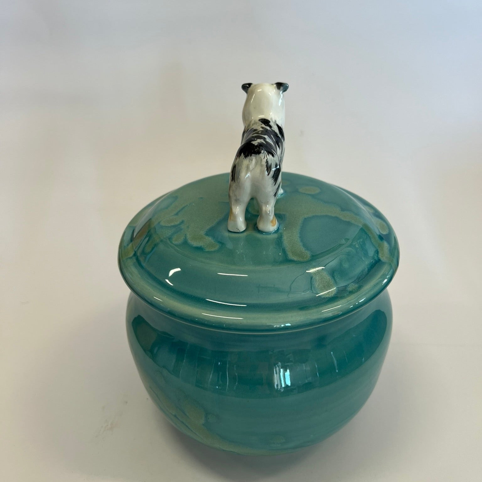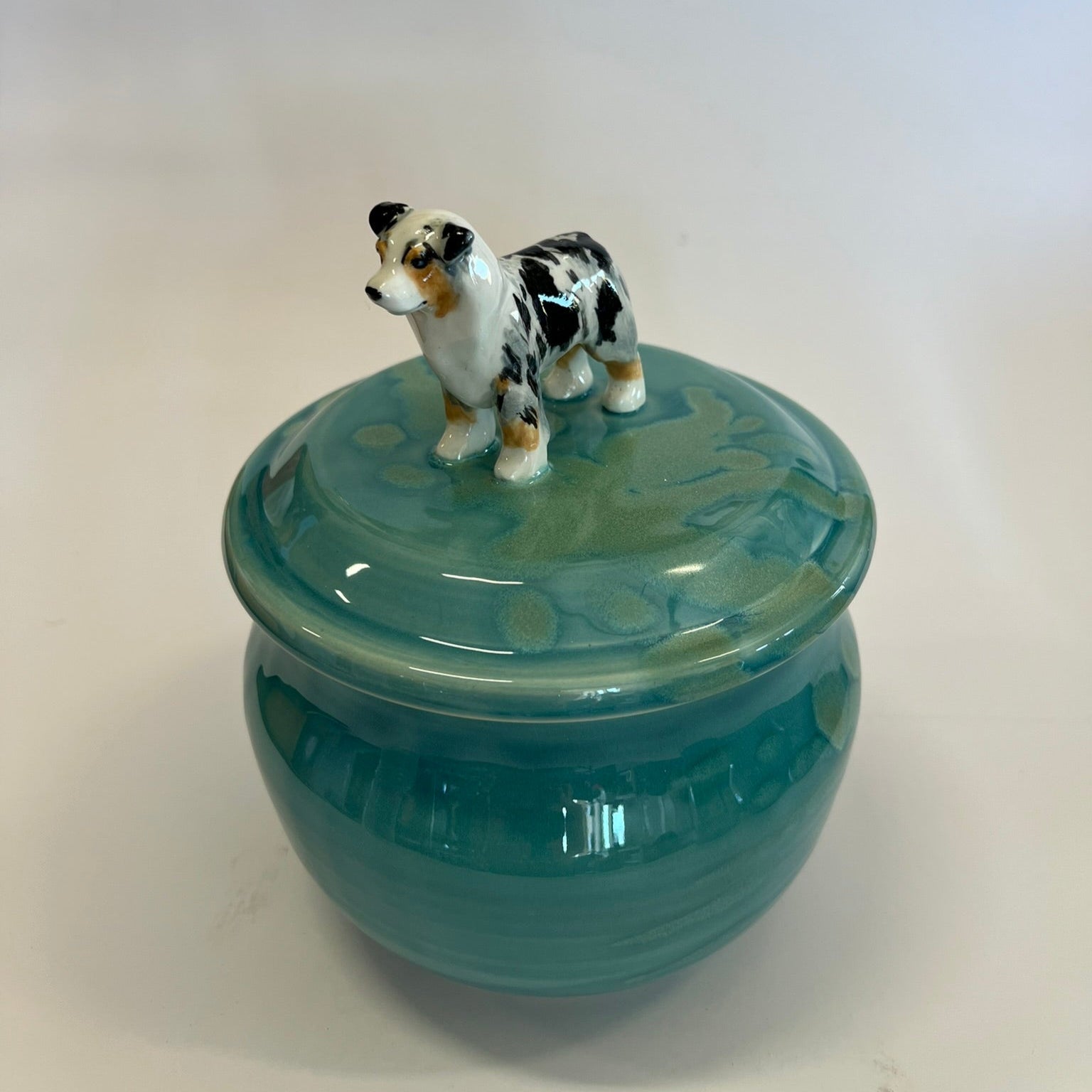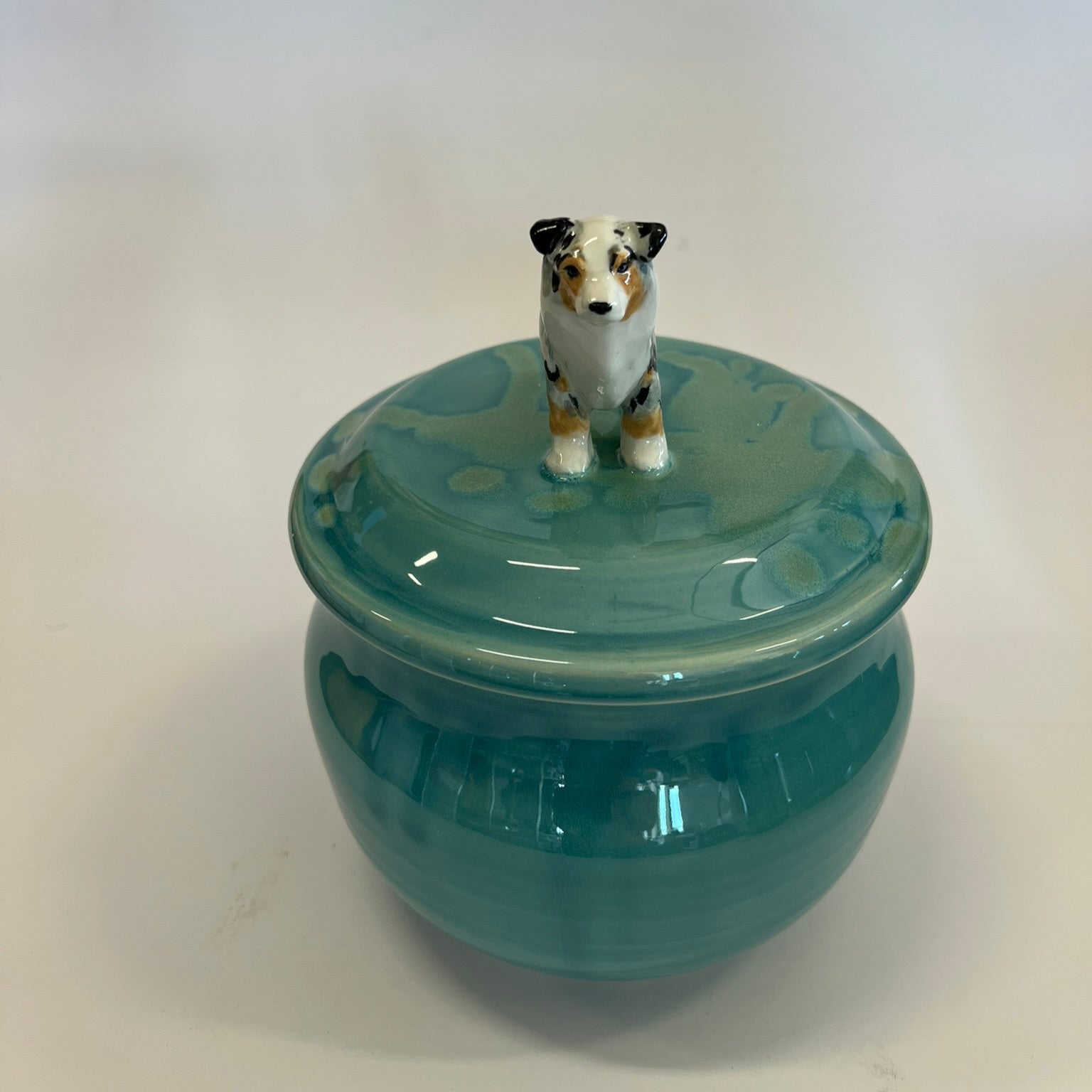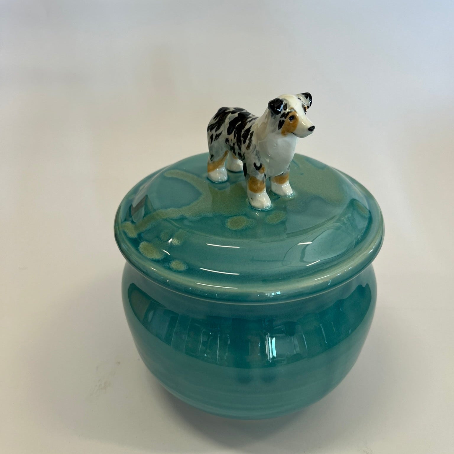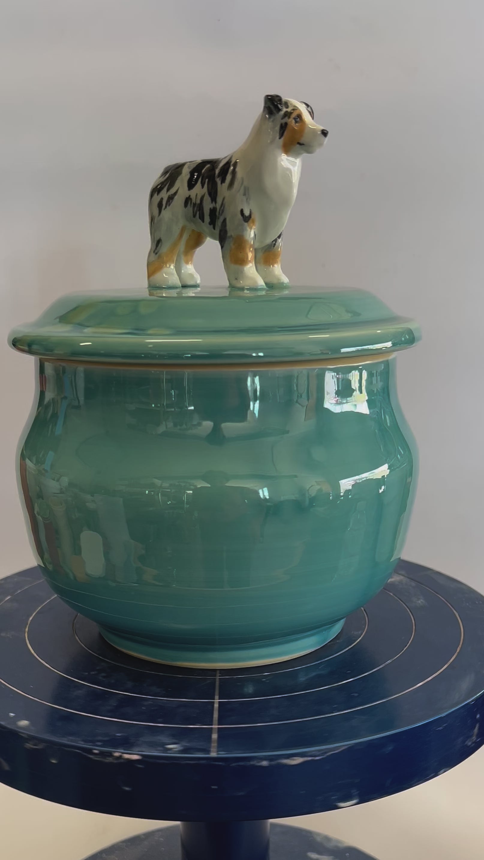 Each treat jar is uniquely handmade, featuring a hand-thrown ceramic base and a one-of-a-kind sculpted figurine of your beloved pets. Perfect for storing dog treats—or anything else you choose!