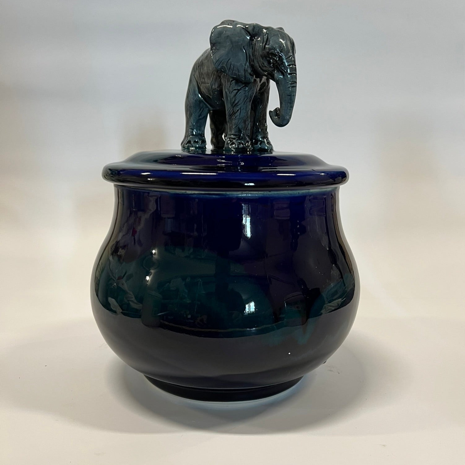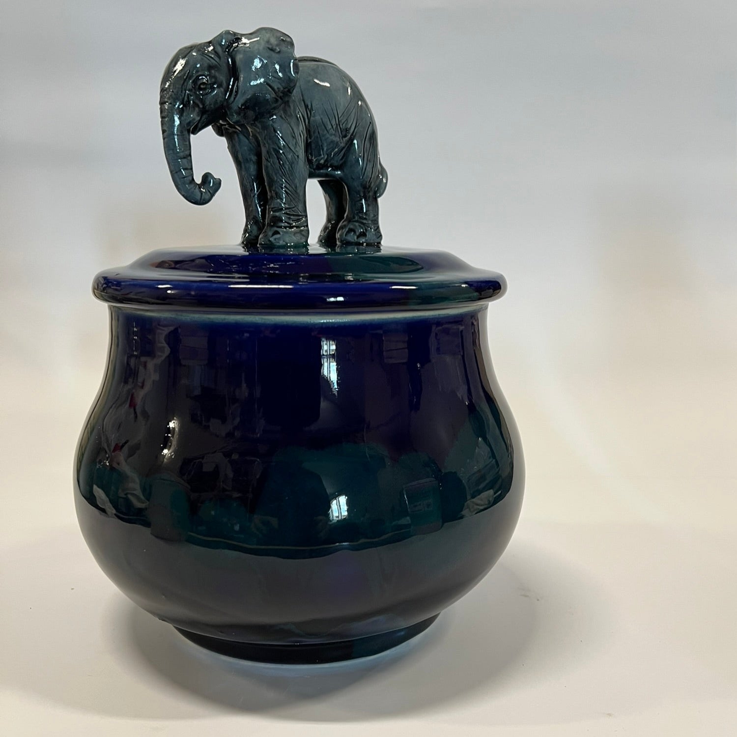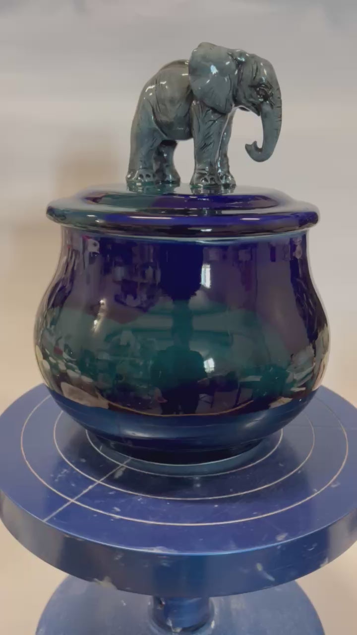 Each treat jar is uniquely handmade, featuring a hand-thrown ceramic base and a one-of-a-kind sculpted elephant figurine walking gracefully on top. Perfect for storing treats—or anything else you choose!