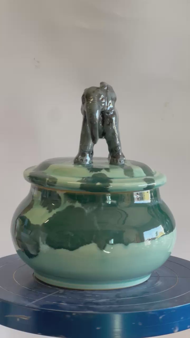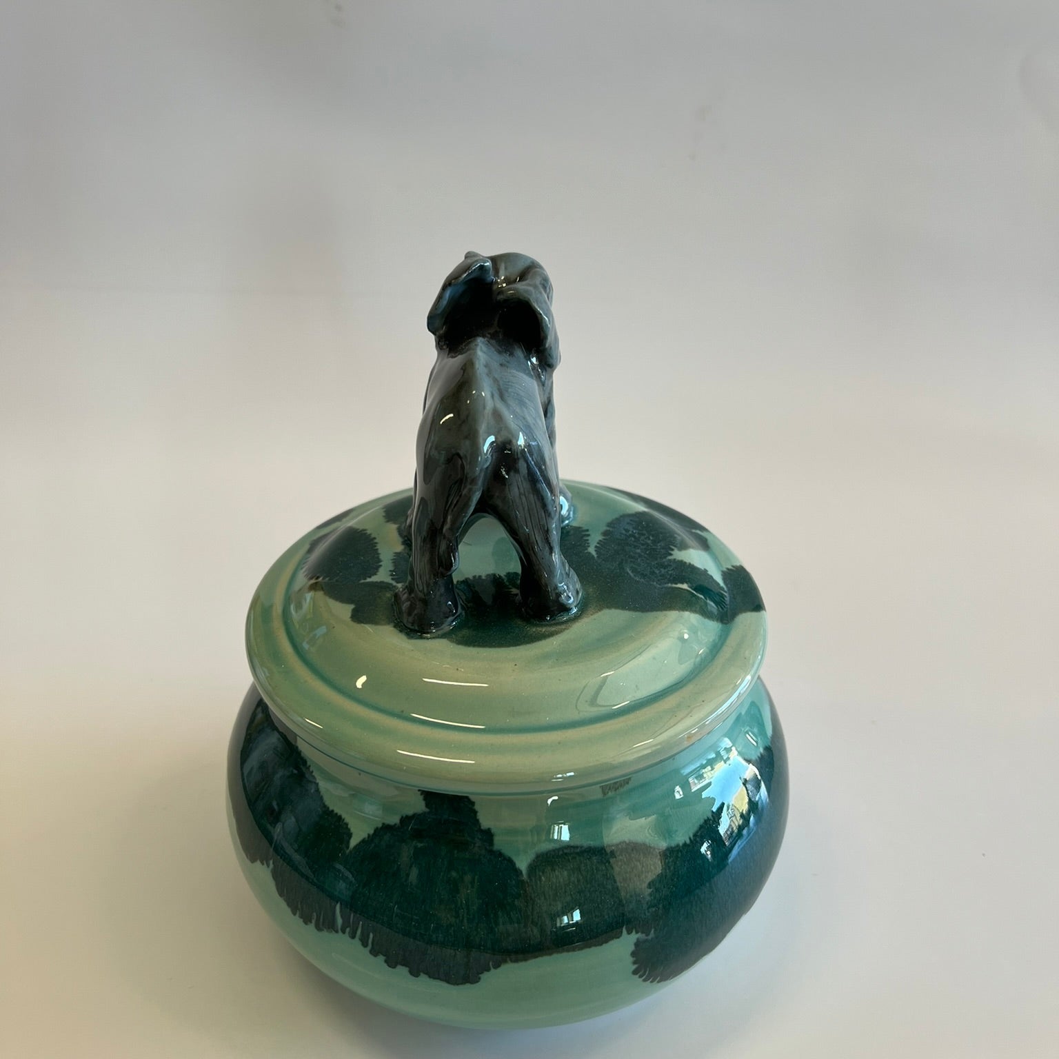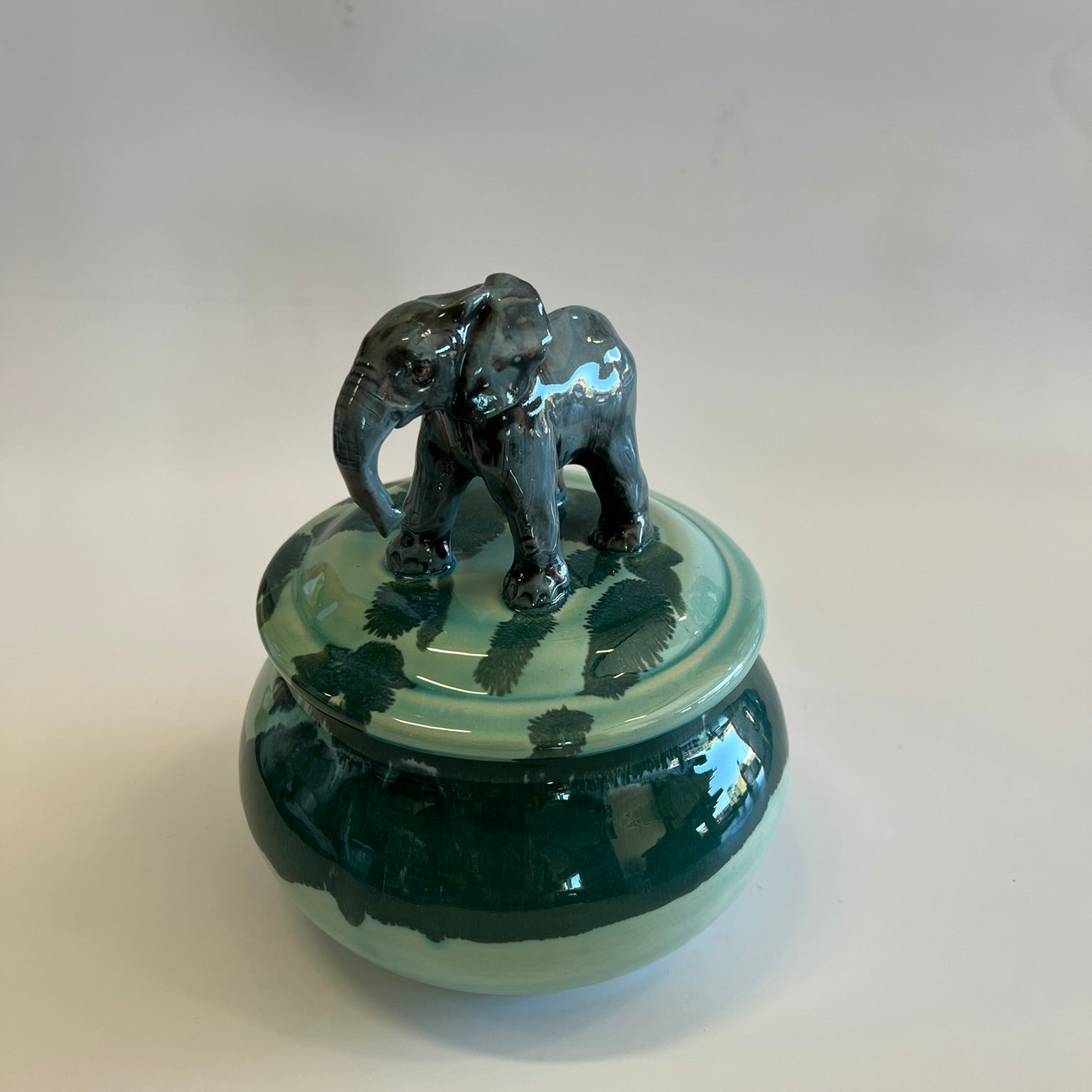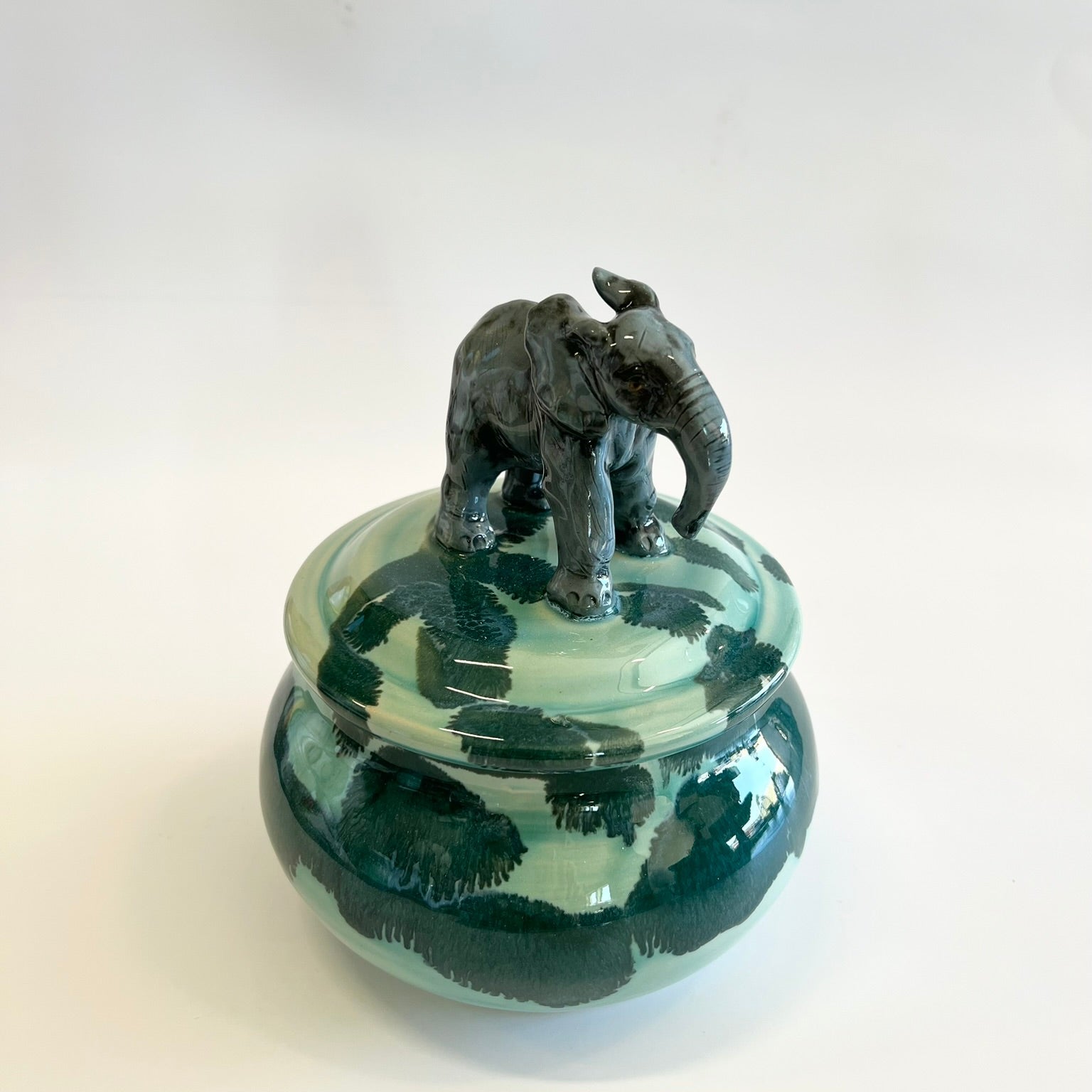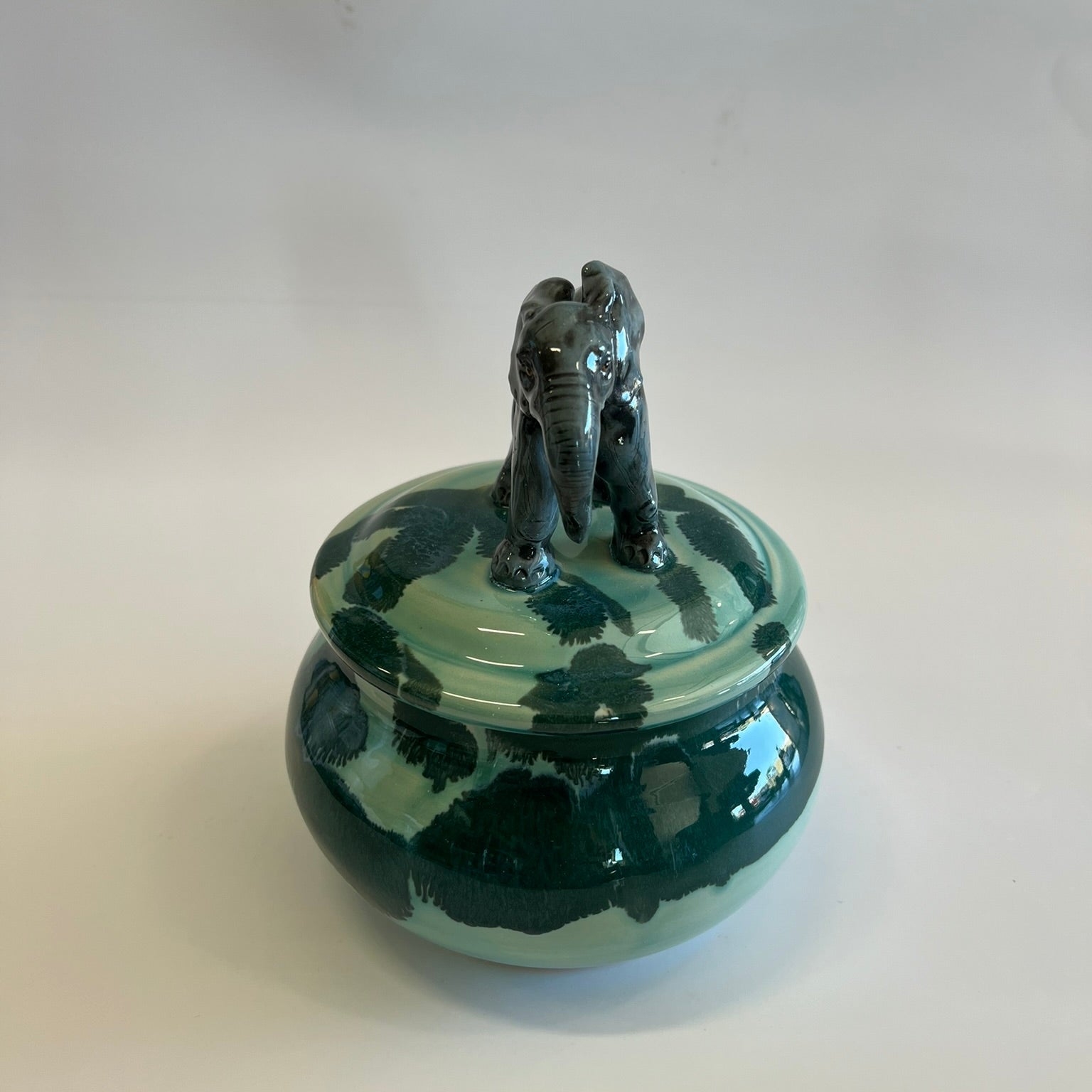 Each treat jar is uniquely handmade, featuring a hand-thrown ceramic base and a one-of-a-kind sculpted elephant figurine walking gracefully on top. Perfect for storing treats—or anything else you choose!