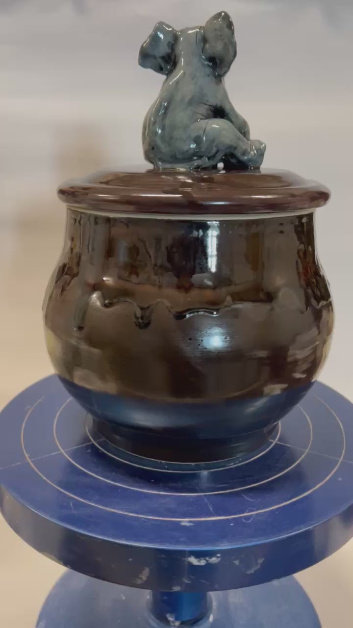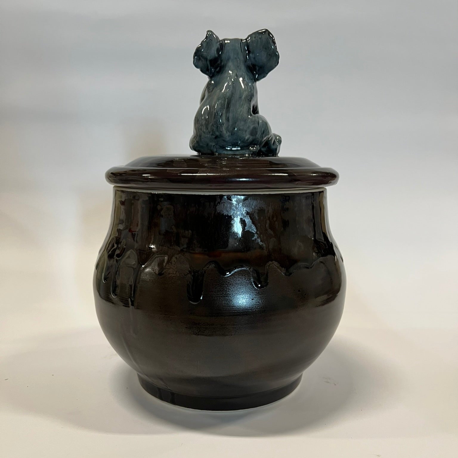 Each treat jar is uniquely handmade, featuring a hand-thrown ceramic base and a one-of-a-kind sculpted elephant figurine walking gracefully on top. Perfect for storing treats—or anything else you choose!
