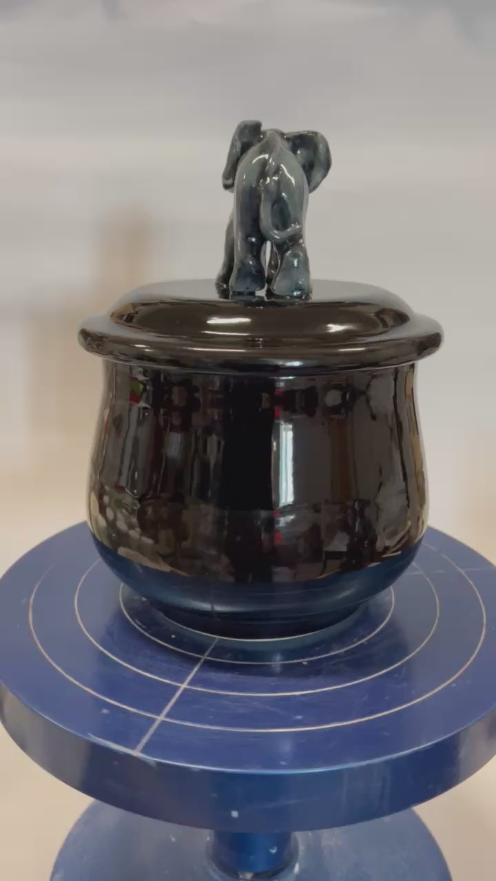 Each treat jar is uniquely handmade, featuring a hand-thrown ceramic base and a one-of-a-kind sculpted elephant figurine walking gracefully on top. Perfect for storing treats—or anything else you choose!