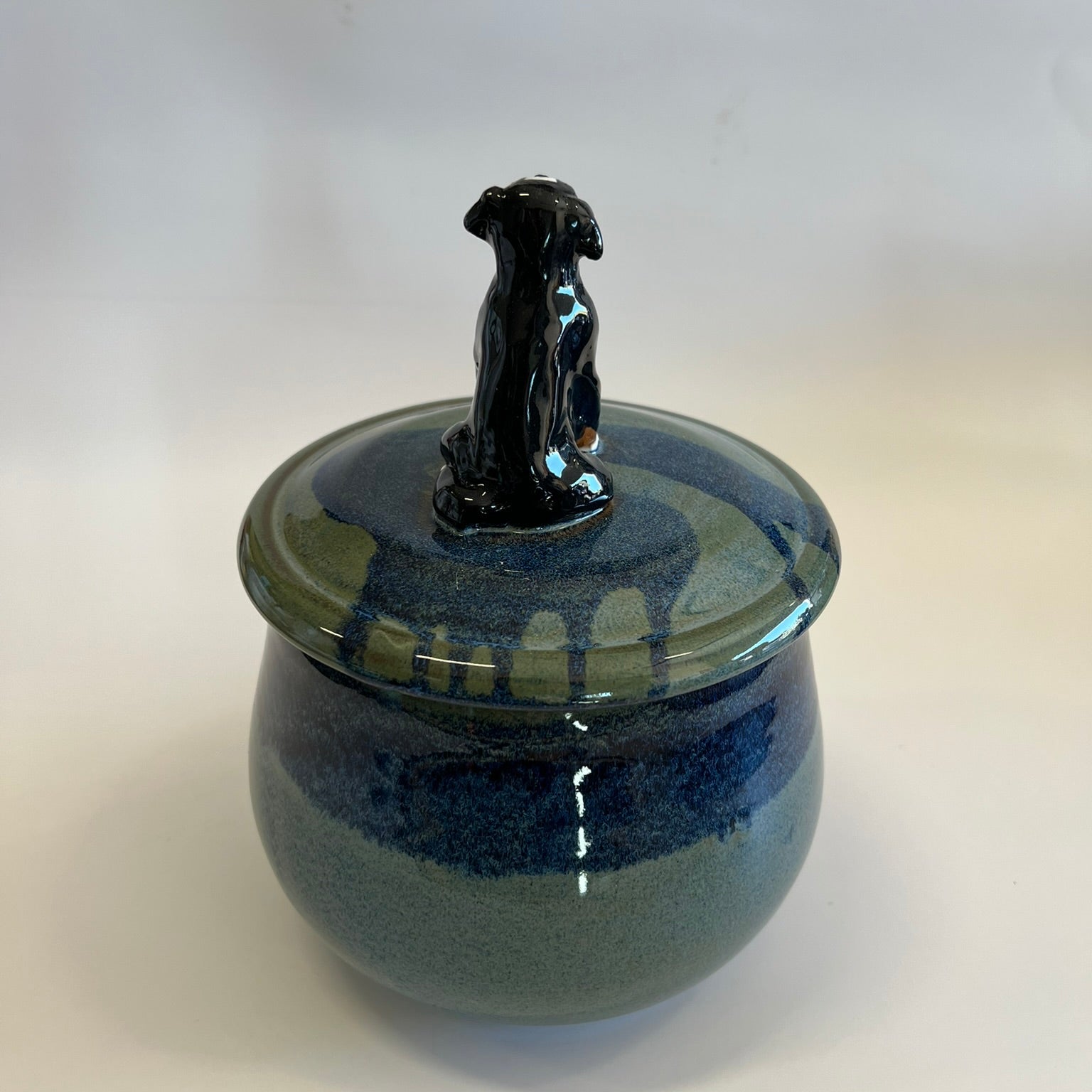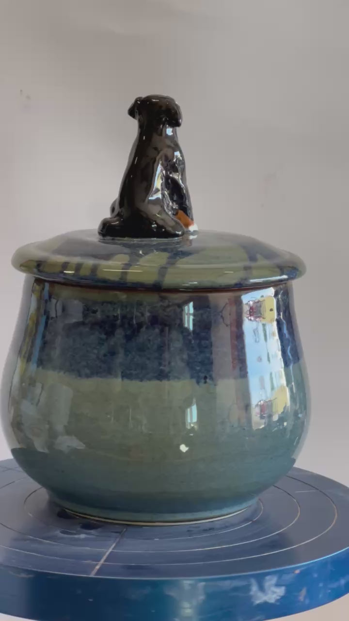 Each treat jar is uniquely handmade, featuring a hand-thrown ceramic base and a one-of-a-kind sculpted figurine of your beloved pets. Perfect for storing dog treats—or anything else you choose!