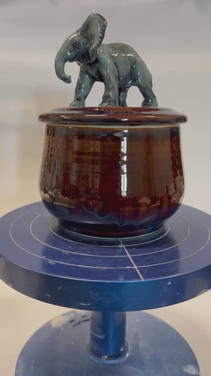 Each treat jar is uniquely handmade, featuring a hand-thrown ceramic base and a one-of-a-kind sculpted elephant figurine walking gracefully on top. Perfect for storing treats—or anything else you choose!
