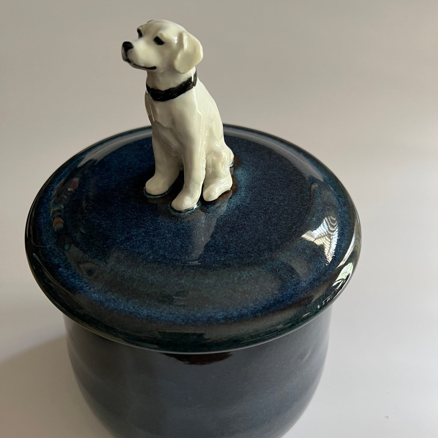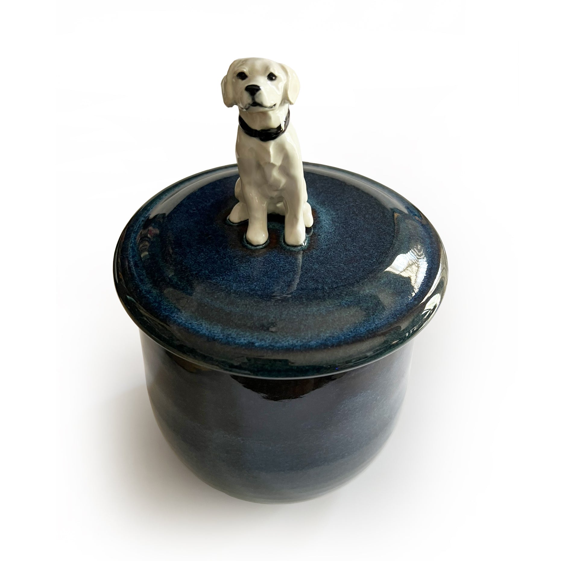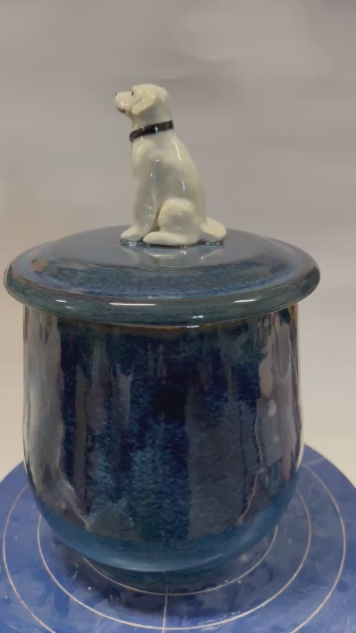 Each treat jar is expertly handmade, featuring a hand-thrown ceramic base with a one-of-a-kind sculpted Golden Retriever figurine mounted on top. Perfect for storing treats—or anything else you choose!